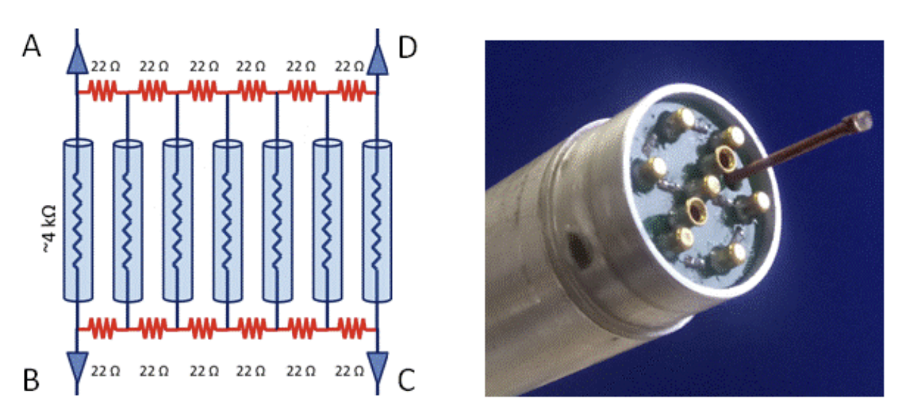In the Loki SANS instrument, the implementation of multiplexing techniques significantly reduces the number of required readout channels for the Boron Coated Straw Tubes (BCSs). This method involves connecting a resistive chain between the BCSs at both ends, as illustrated in the diagram. The resistance between each BCS is set to 22 Ω, which is intentionally chosen to be much smaller than the resistance of the BCS wires (approximately 4 kΩ). This minimizes the impact of the chain resistance on the position calculation along the length of the BCSs. The resistive chain is housed on a compact printed circuit board (PCB) that fits within the aluminum body of the tube.